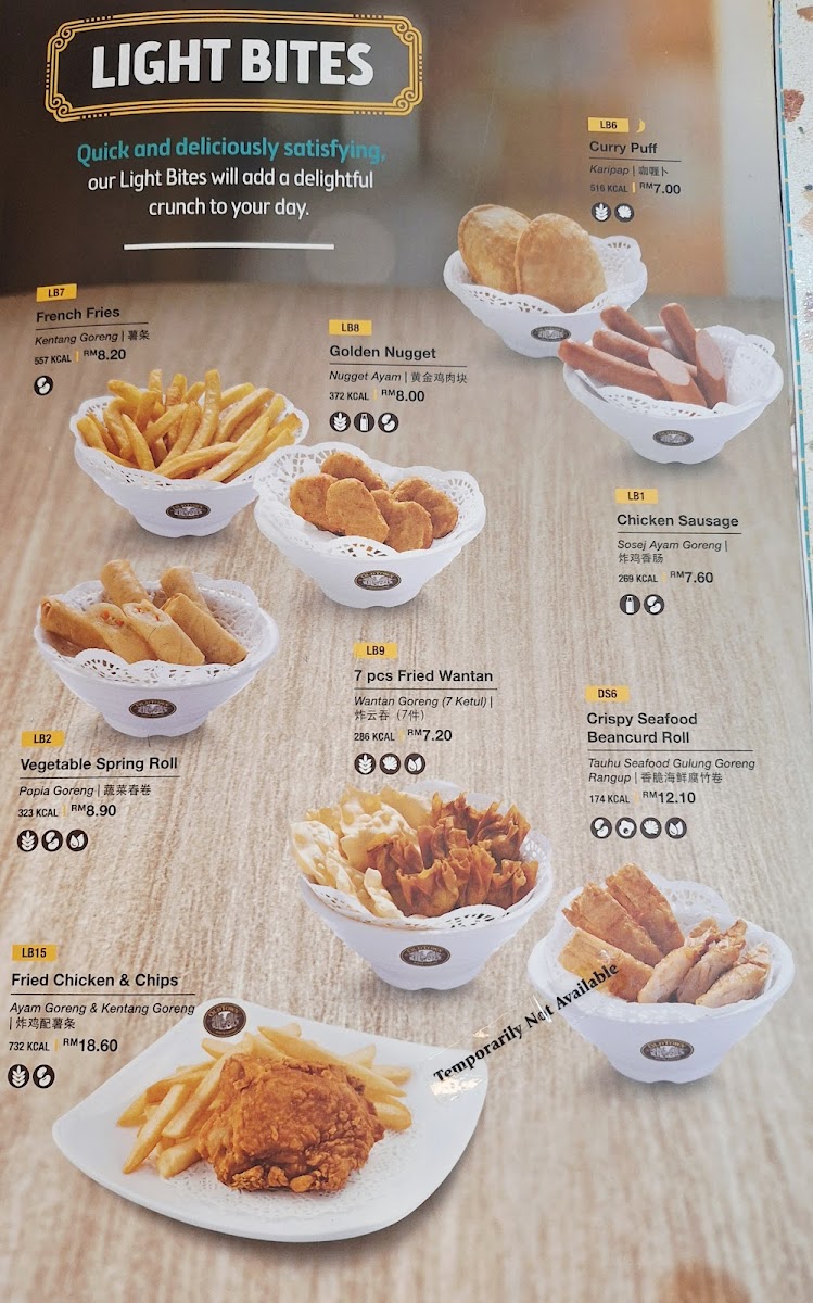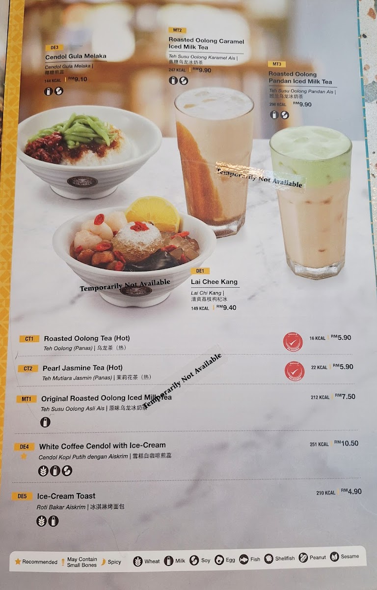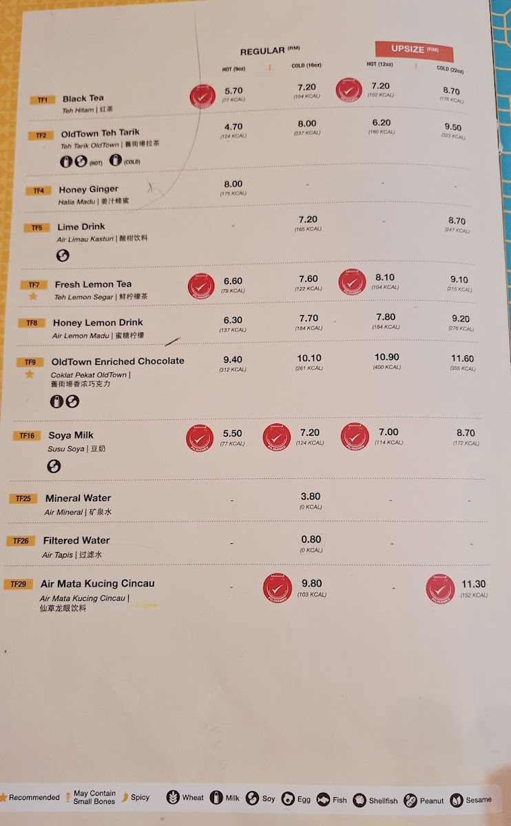 Tea and Beverage Selections: A comprehensive range of hot and cold drinks is available, including classic hot teas like Black Tea and Fresh Lemon Tea, as well as popular local favorites such as OldTown Teh Tarik and Honey Lemon Drink. Cold beverages such as Lime Drink, OldTown Enriched Chocolate, and Ice Soy Milk offer refreshing options alongside traditional tastes.