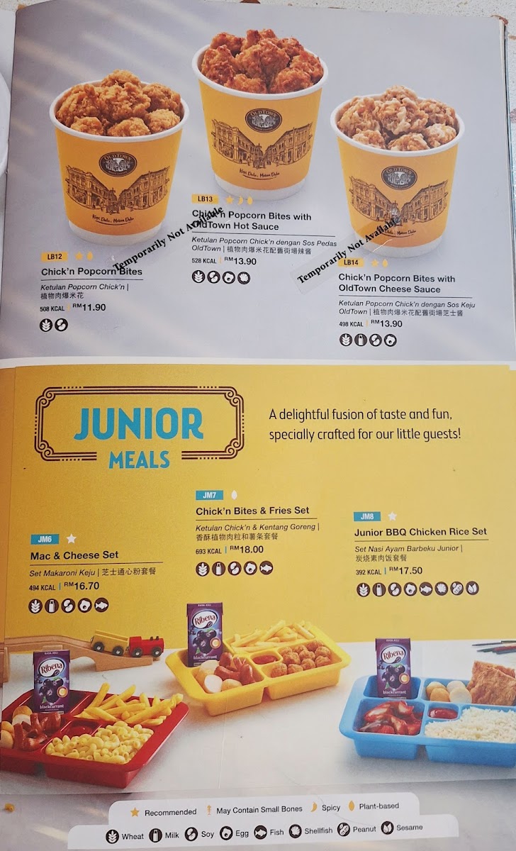Rice Dishes: The rice section highlights traditional Malaysian offerings like Mushroom & Chicken Steamed Rice and assorted varieties of OldTown Nasi Lemak paired with fried chicken, sambal udang petai, chicken rendang, or chicken curry. These dishes are generally served with complementary sides and are suitable for more substantial meals.